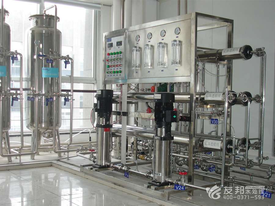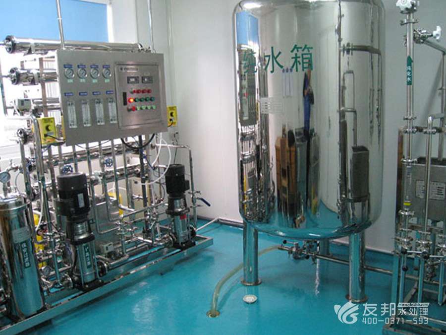 2、预处理→一级反渗透→加药机(PH调节)→中间水箱→第二级反渗透(正电荷反渗膜)→纯水箱→纯水泵→EDI装置→紫外线杀菌器→0.2或0.5μm精密过滤器→用水对象(≥17MΩ.CM)