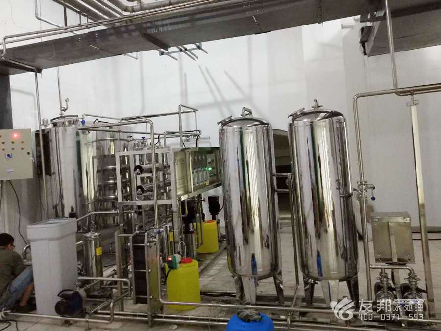地下水或自来水——原水增压泵——石英砂过滤器——活性炭过滤器——加药装置——精密过滤器——一级高压泵——一级反渗透——二级高压泵——二级反渗透——水箱——成品水